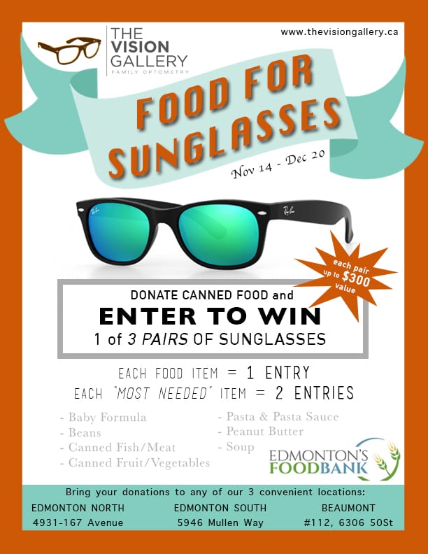 The Vision Gallery is hosting its First Annual FOOD for SUNGLASSES – a food bank drive in support of Edmonton’s Food Bank. Because it has been such a tough year in our economy, we want to do what we can to help keep our community going. Please donate what you can!